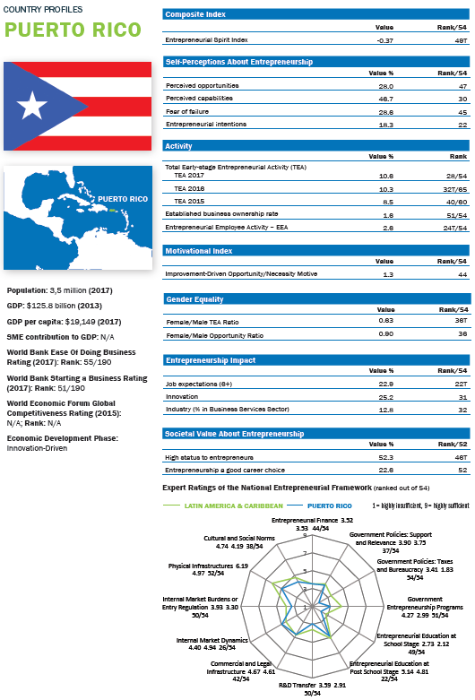 En conclusión, los resultados del GEM en el 2017 en Puerto Rico muestran una población que, a pesar de la prolongada recesión que atraviesa, percibe buenas oportunidades para emprender en su entorno y se considera capacitada para hacerlo a pesar de ciertos valores socioculturales que no promueven la creación de emprendimientos. Esto se tradujo en una tasa de actividad emprendedora (TEA) superior a la de las economías innovadoras. No obstante, la importante brecha entre las empresas nacientes y las nuevas apunta de manera clara a un problema urgente en el sentido de que las iniciativas nacientes no prevalecen a través del tiempo. Este problema parece tener sus causas en los factores condicionantes del entorno que año tras año son valorados casi en su totalidad por los expertos encuestados por debajo de la media de los países participantes.