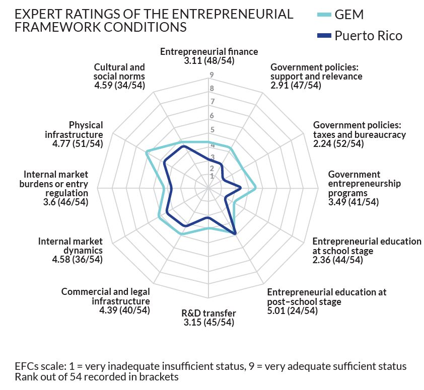 El NECI refleja una conclusión que se repite año tras año: más allá de los efectos del paso de los huracanes en septiembre 2017 y el posterior proceso de recuperación, el contexto de Puerto Rico no favorece el desarrollo de emprendimientos. Entre los factores que menos contribuyen se distinguen la burocracia, los impuestos y las reglamentaciones gubernamentales, y la educación hacia el emprendimiento a nivel primario y secundario. Estos son los factores del contexto peor valorados por los expertos en 2018. A pesar de que los expertos encuestados cambian cada año, las consultas han ofrecido este mismo resultado de manera consistente desde 2013, y también han sido consistentes en la valoración de los demás factores. Al comparar con otros países, sin embargo, hay un elemento que destaca positivamente: la educación hacia el emprendimiento en instituciones postsecundarias.